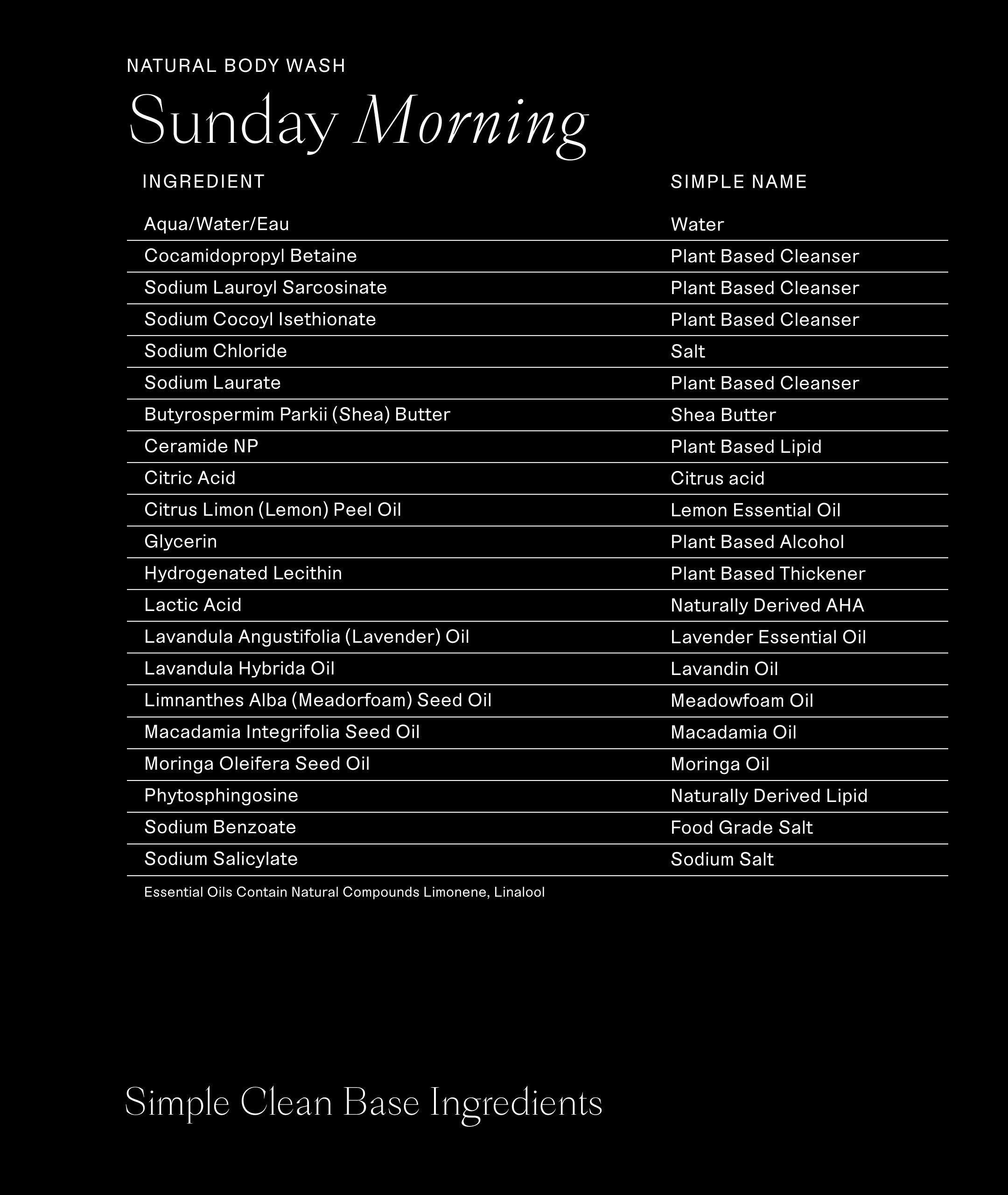 Aqua/Water/Eau, Cocamidopropyl Betaine, Sodium Lauroyl Sarcosinate, Sodium Cocoyl Isethionate, Sodium Chloride, Sodium Laurate, Butyrospermum Parkii (Shea) Butter, Ceramide NP, Citric Acid, Citrus Limon (Lemon) Peel Oil, Glycerin, Hydrogenated Lecithin, Lactic Acid, Lavandula Angustifolia (Lavender) Oil, Lavandula Hybrida Oil, Limnanthes Alba (Meadowfoam) Seed Oil, Macadamia Integrifolia Seed Oil, Moringa Oleifera Seed Oil, Phytosphingosine, Sodium Benzoate, Sodium Salicylate, Limonene, Linalool