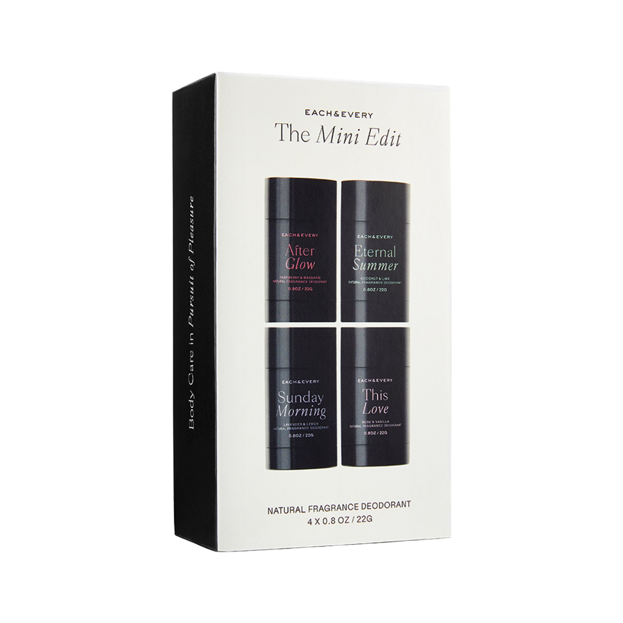 The Mini Edit includes four perfectly sized deodorants featuring our most-loved scents. Made for discovery, gifting, or life on the go — so you can experience the collection and choose your signature scent with confidence.